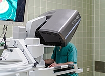 Bei der robotergestützten Chirurgie sitzt der Operateur an einer speziellen Steuerkonsole. Dort sieht er das Operationsgebiet in einem stark vergrößerten, dreidimensionalen Bild. Über feinste Handbewegungen steuert er die Instrumente, die im Körper der Patientin oder des Patienten arbeiten – besonders ruhig, exakt und millimetergenau.